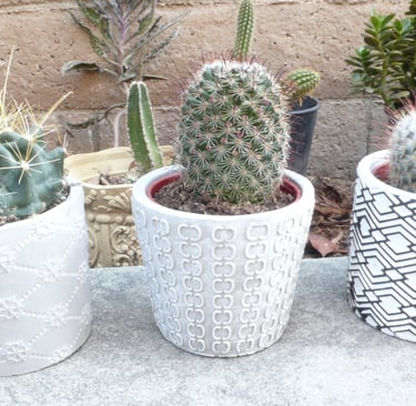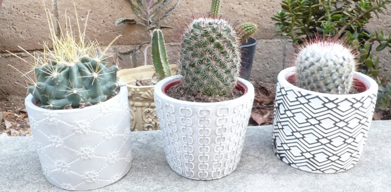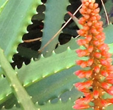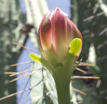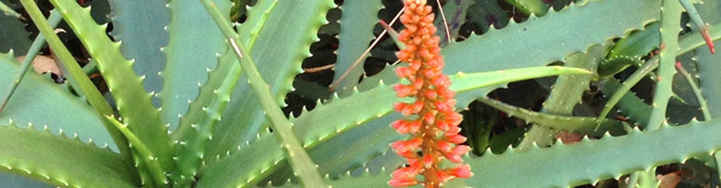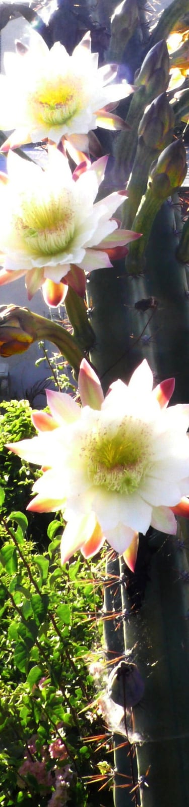 All photos taken in my garden. Top header: aloe eru. Left margin: night blooming cereus, pink flower 9 a.m. Right margin: Peruvian Cereus cactus flowers 6 a.m. Bottom: small barrel cacti.