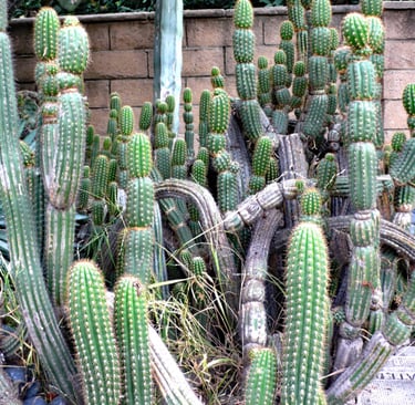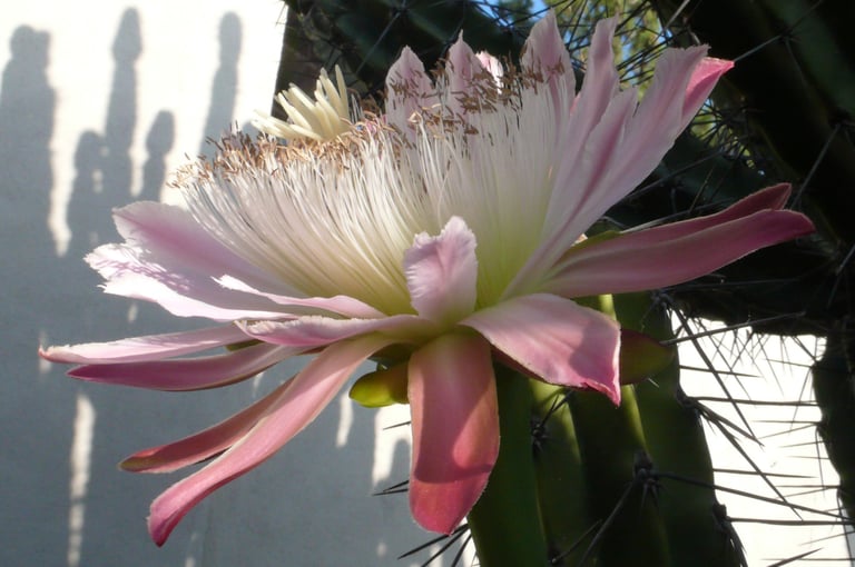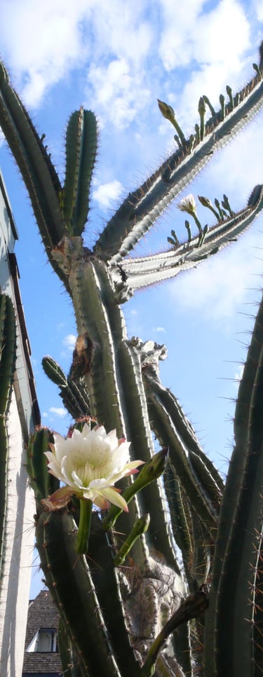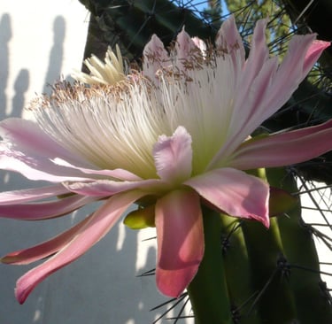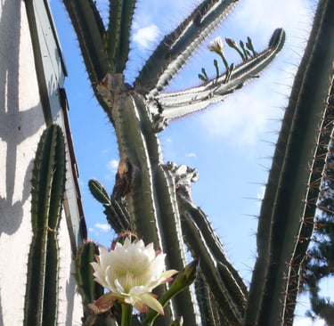 All photos taken in my garden. Top header: aloe eru. Left margin: Peruvian cereus. Right margin: trichocereus. Bottom: pink cereus flower.
